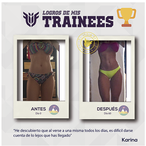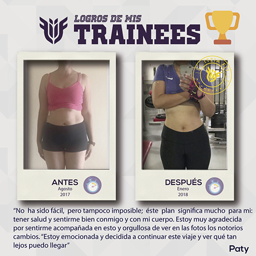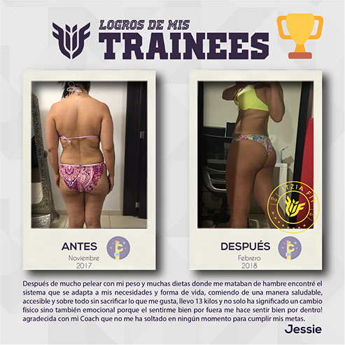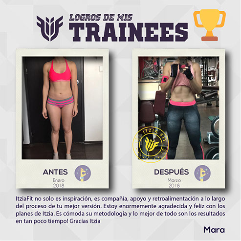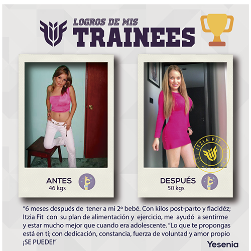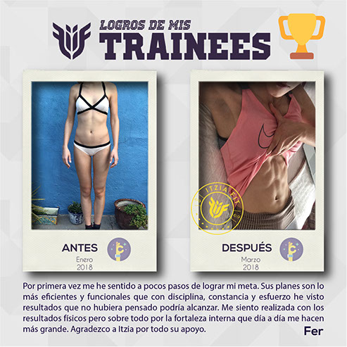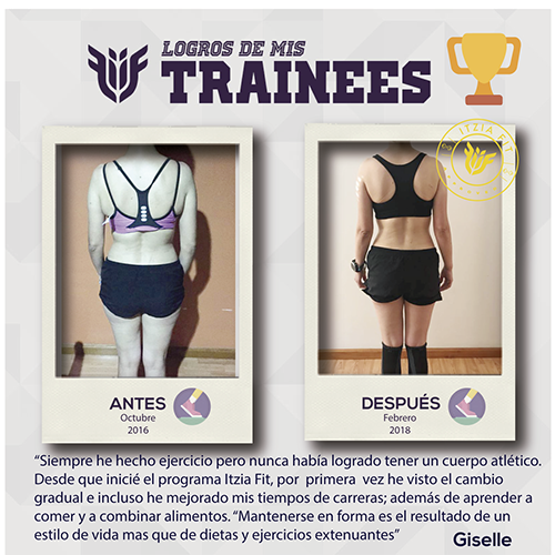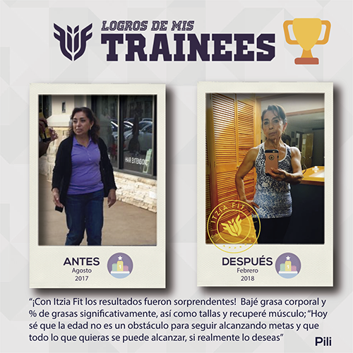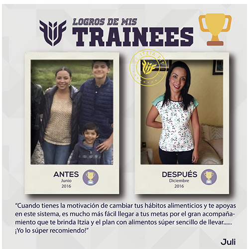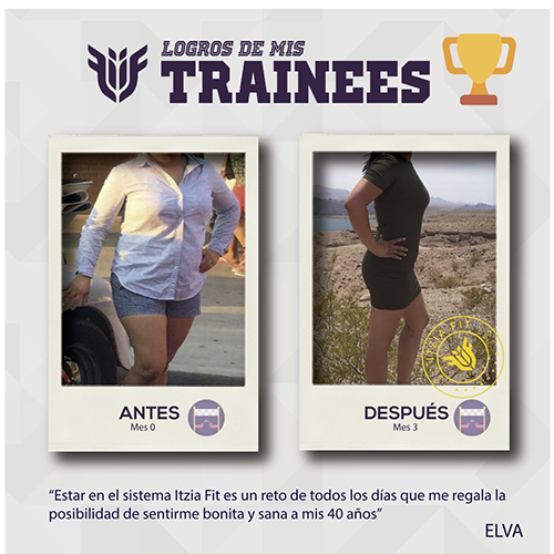 Si algo me encanta es poder compartir con ustedes los testimonios de mis trainees ya que con cada uno vuelvo a vivir el reto; me identifico con cada uno de una manera única y especial; sé que ponen en mis manos sus anhelos, sus sueños, sus metas, su esfuerzo constante y su voluntad, y agradecida por confiar en mi y en el sistema Itzia fit me comprometo con responsabilidad a completar sus carreras con alimentación y ejercicio de acuerdo a sus metas.